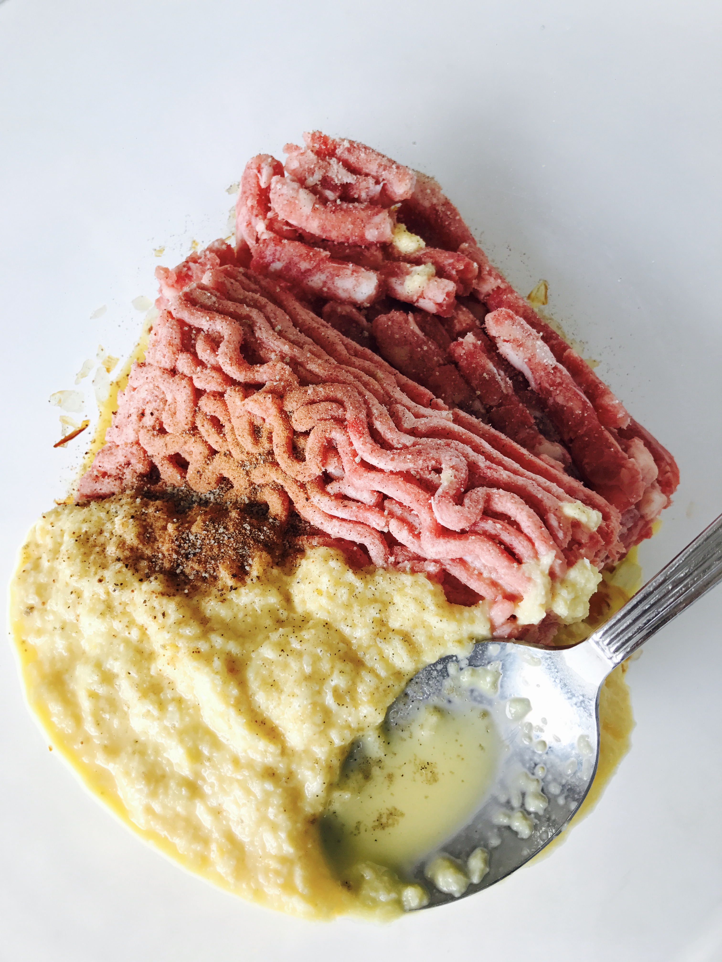 玉ねぎの粗熱が取れたら、ひき肉、先ほどのたまご、ナツメグ、塩コショウを全てしっかりと混ぜ合わせます。