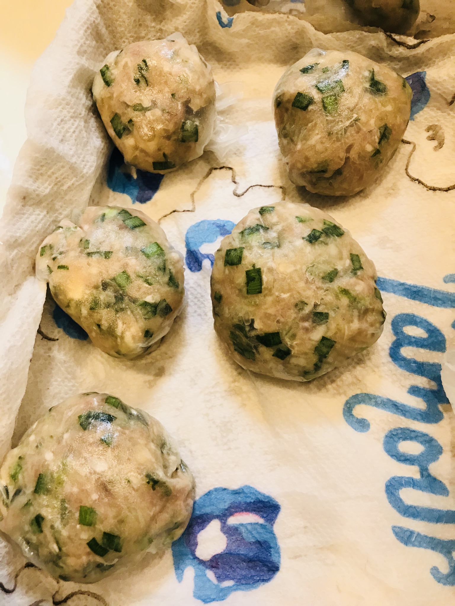 ライスペーパーを水にぬらして柔らかくしたら肉だねを入れて巾着みたいにして、余った部分は切っておきます