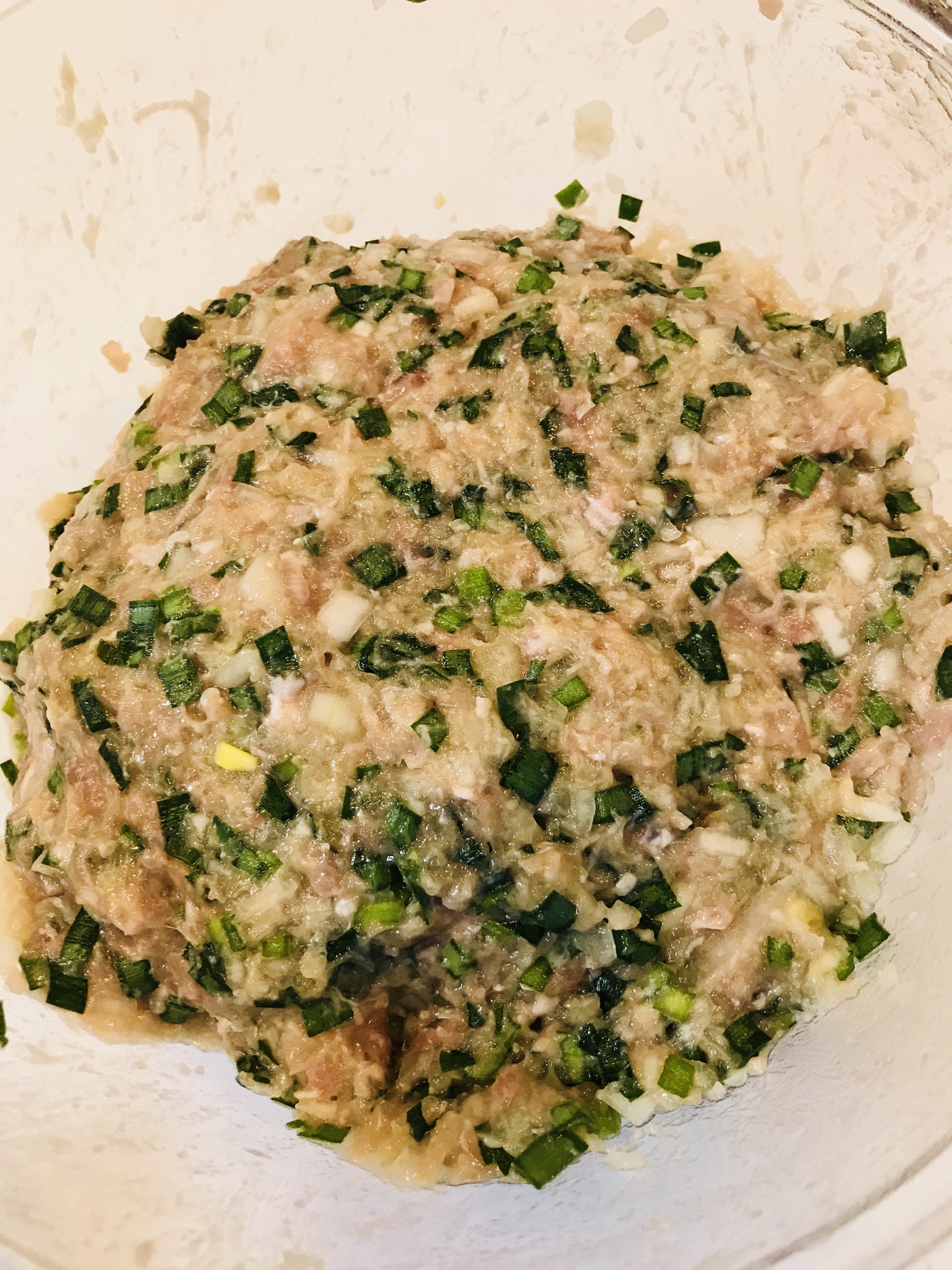 玉ねぎはみじん切り、にらは5cm刻みにして片栗粉をまぶしてます。お肉と調味料を混ぜ合わせた中に入れてさらに混ぜます。