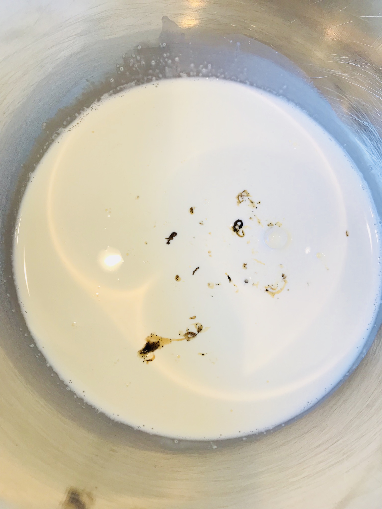 生クリーム、砂糖、バニラペーストとエッセンスを氷水で冷やしながらかために混ぜます。