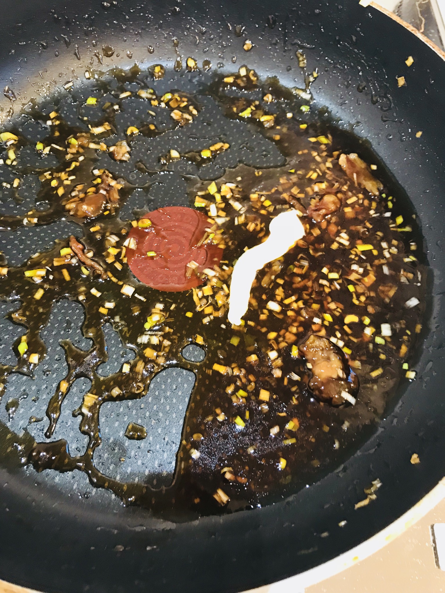 豚肉に塩コショウで下味をつけ片栗粉をまぶしカリッとなったら余計な油をとり、〇をかけます。
