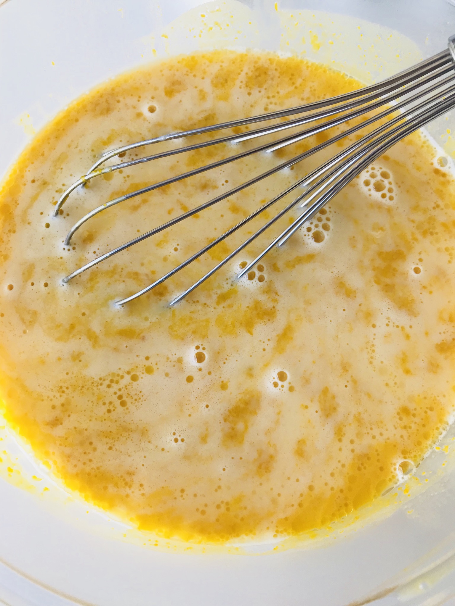 沸騰直前まで温めた牛乳を卵のボウルに入れてしっかりと混ぜ、ラム酒を加えて混ぜます。