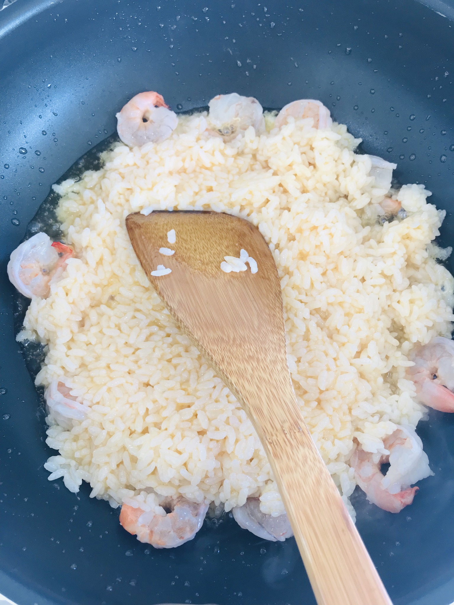 シャンタンDXをお湯で溶かし、溶き卵を混ぜてからご飯を入れてしっかりと混ぜます。そして、強火でご飯を炒めます。