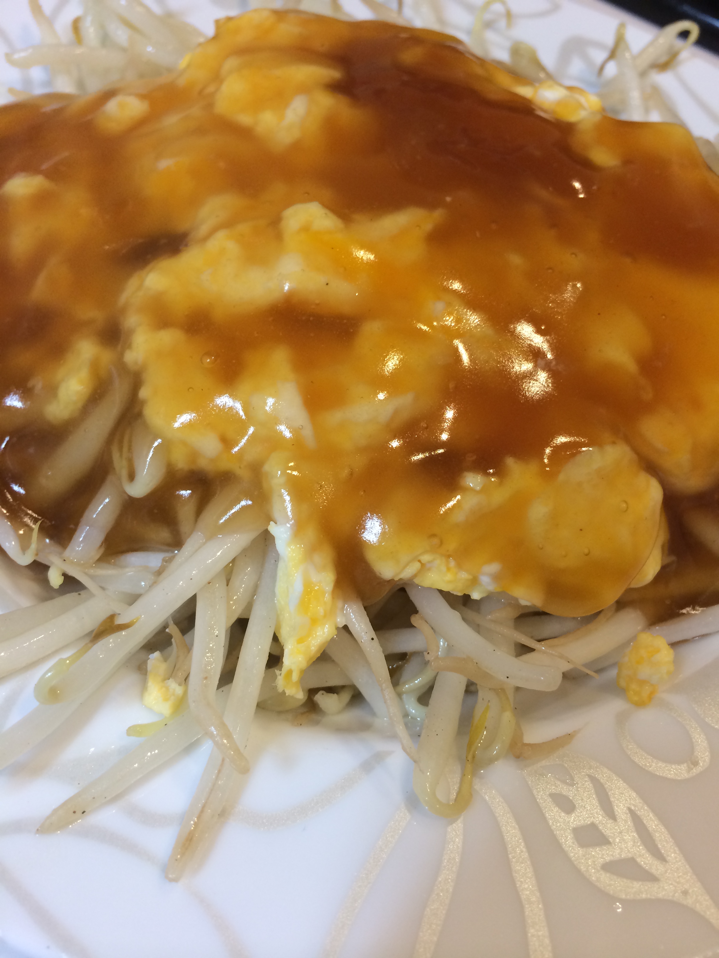 卵のまろやかさにもやしのシャキシャキ感、中華あんのちょっとした酸味が凄い合います。この中華あんは卵との相性が凄く良いので、天津飯を作る時のあんにしても良いなと思いました。