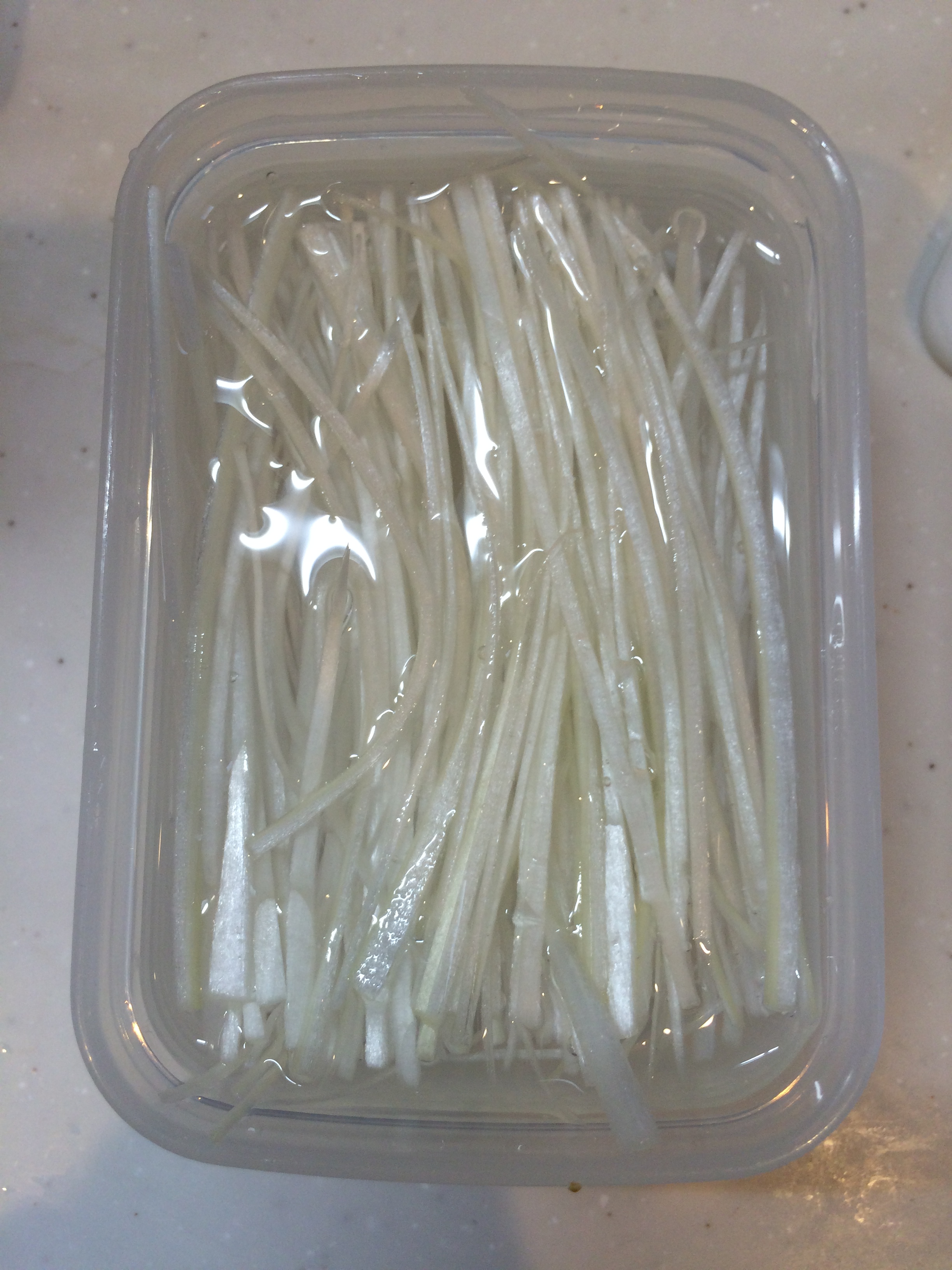 鶏肉漬け置きしている間に白髪ネギを作ります。細い千切りにして冷水にさらしておきます。