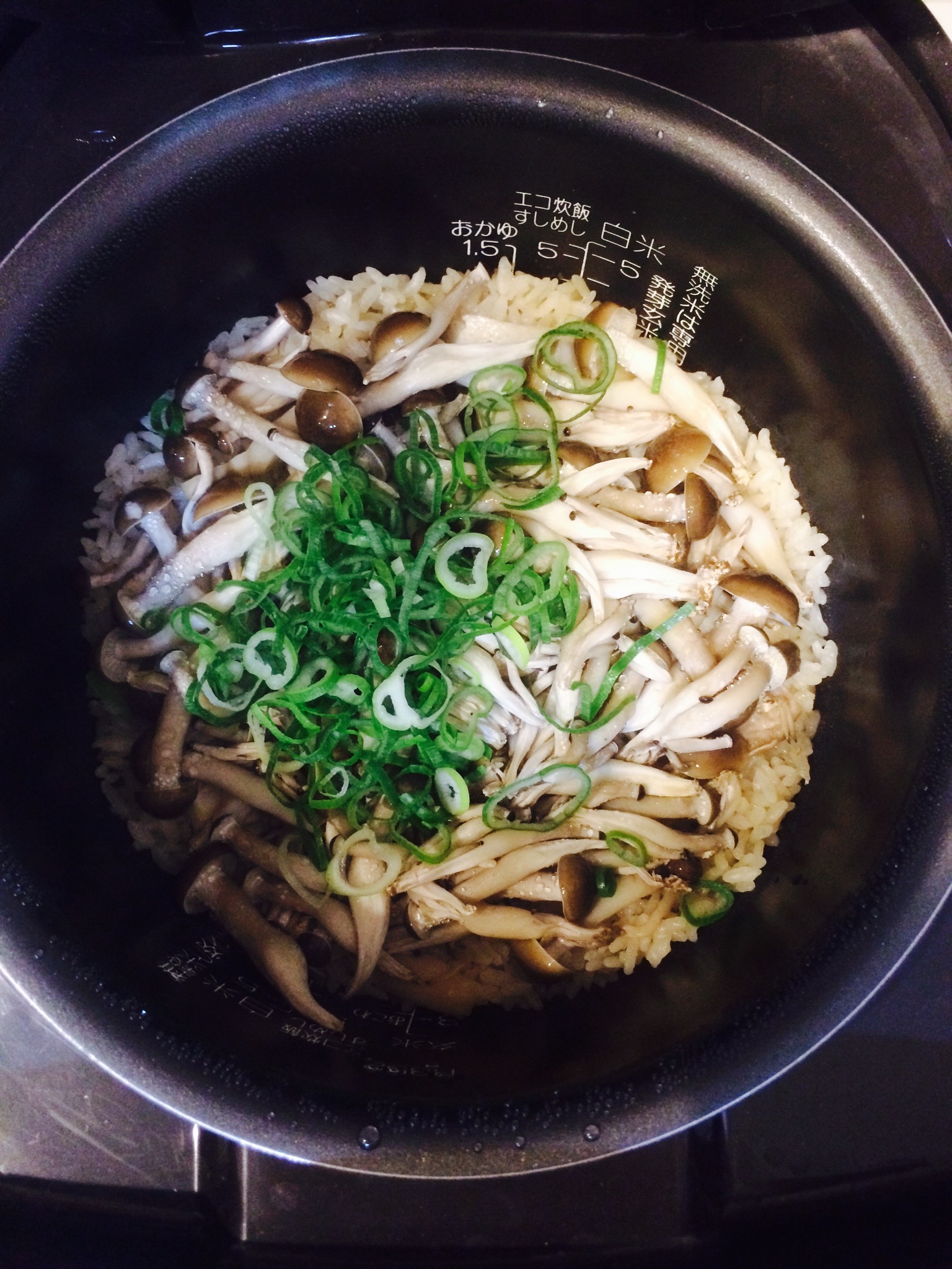 ご飯が炊けたらネギを投入して、一度全体を混ぜてもう1度蓋をして2〜3分ほど蒸らしたら完成です