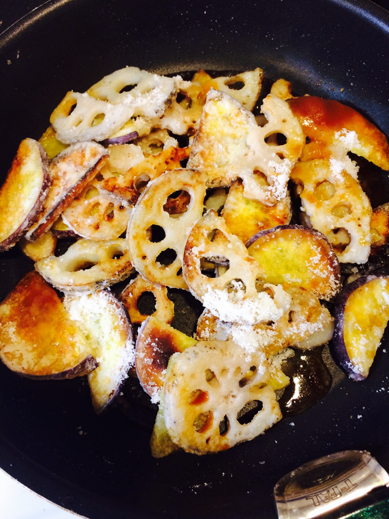 レンコンも一旦取り出して、フライパン油をふき取り、サツマイモとレンコンを戻して○の調味料を合わせます