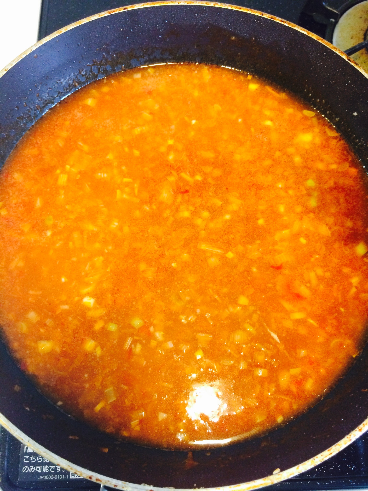 香りが出てきたら豆板醤とケチャップを入れて弱火でじっくり炒めます