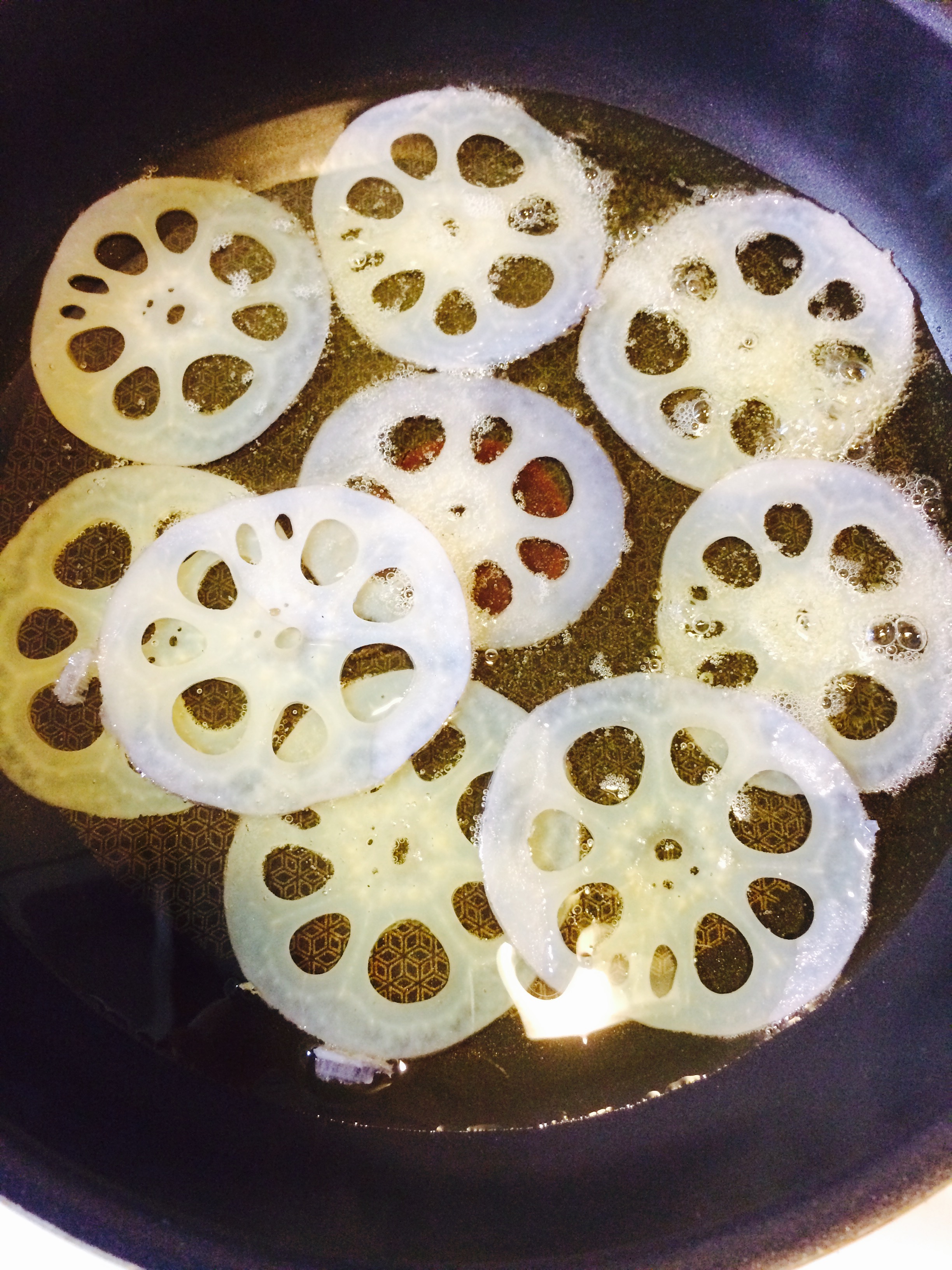 スライサーでカットしたレンコンをサラダ油で揚げていきます