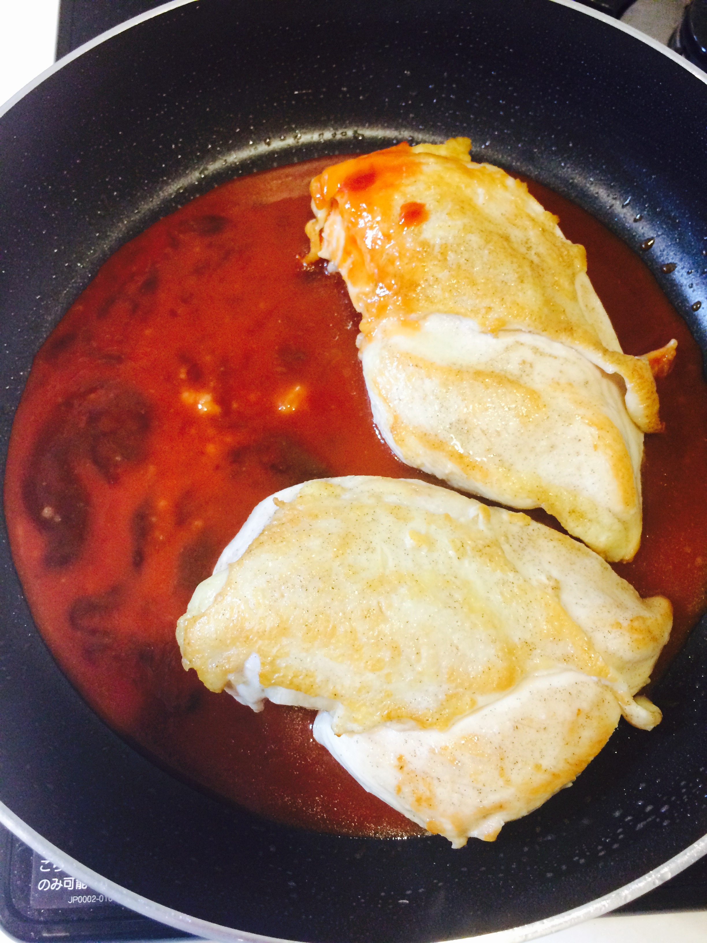 フライパンに油を敷いて鶏肉を皮から焼きます。皮側が焼けたら裏返し、ふたをして6分ほど蒸し焼きにします。