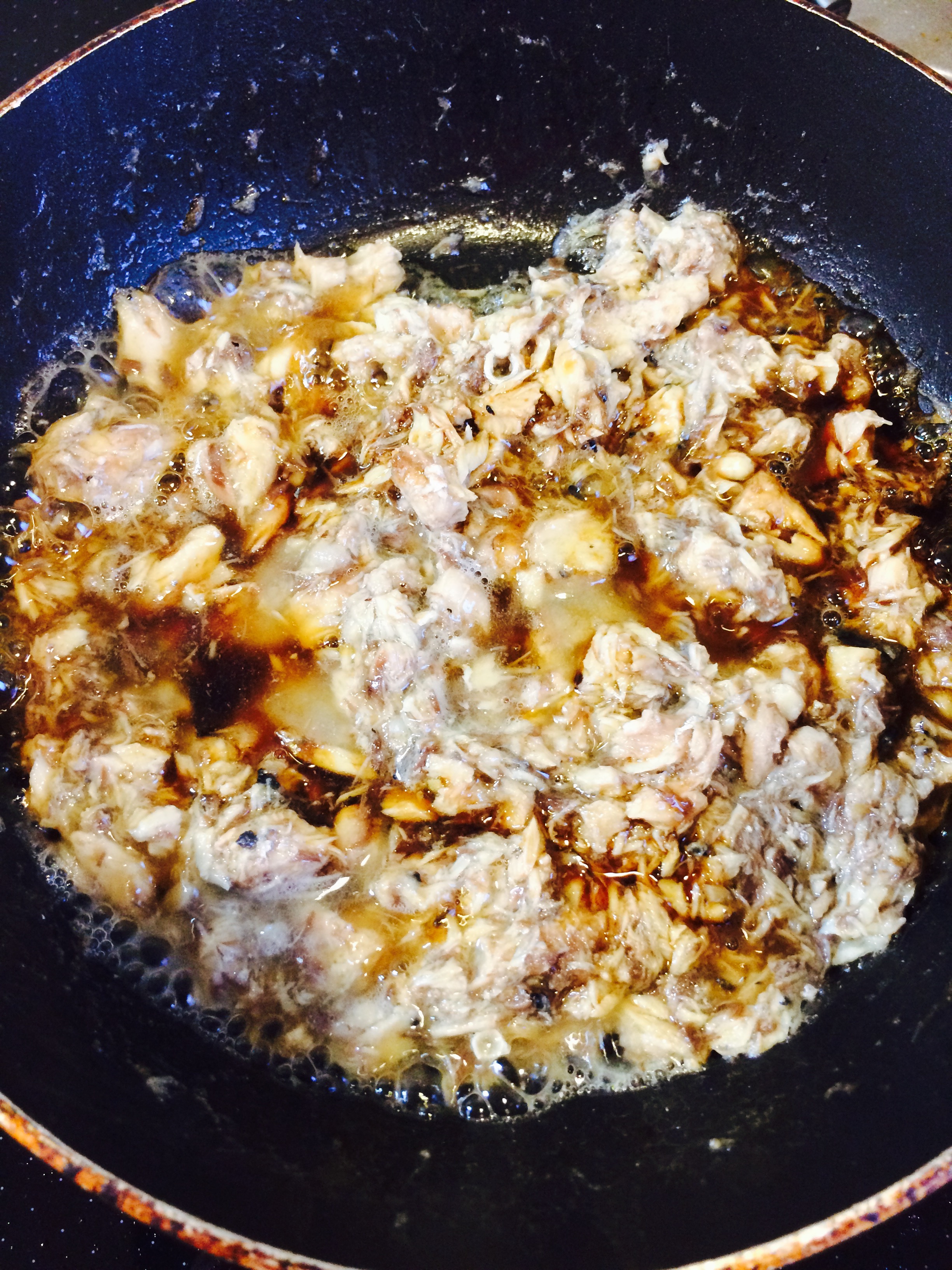 フライパンに水気を切ったサバとショウガを入れて火にかけほぐしながら炒めます。