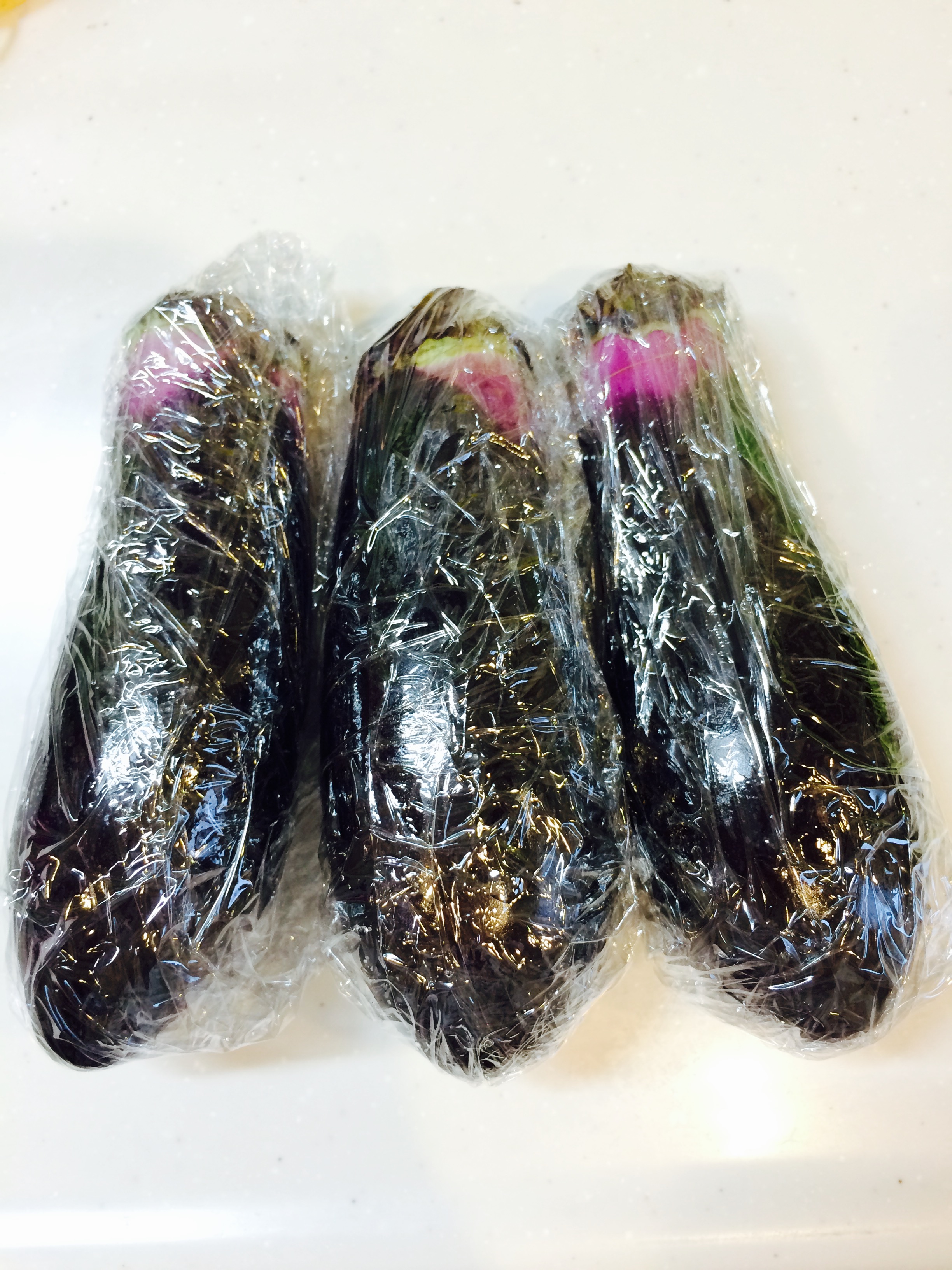 ナスはラップで包み、電子レンジで500wで4分ほどチンします。