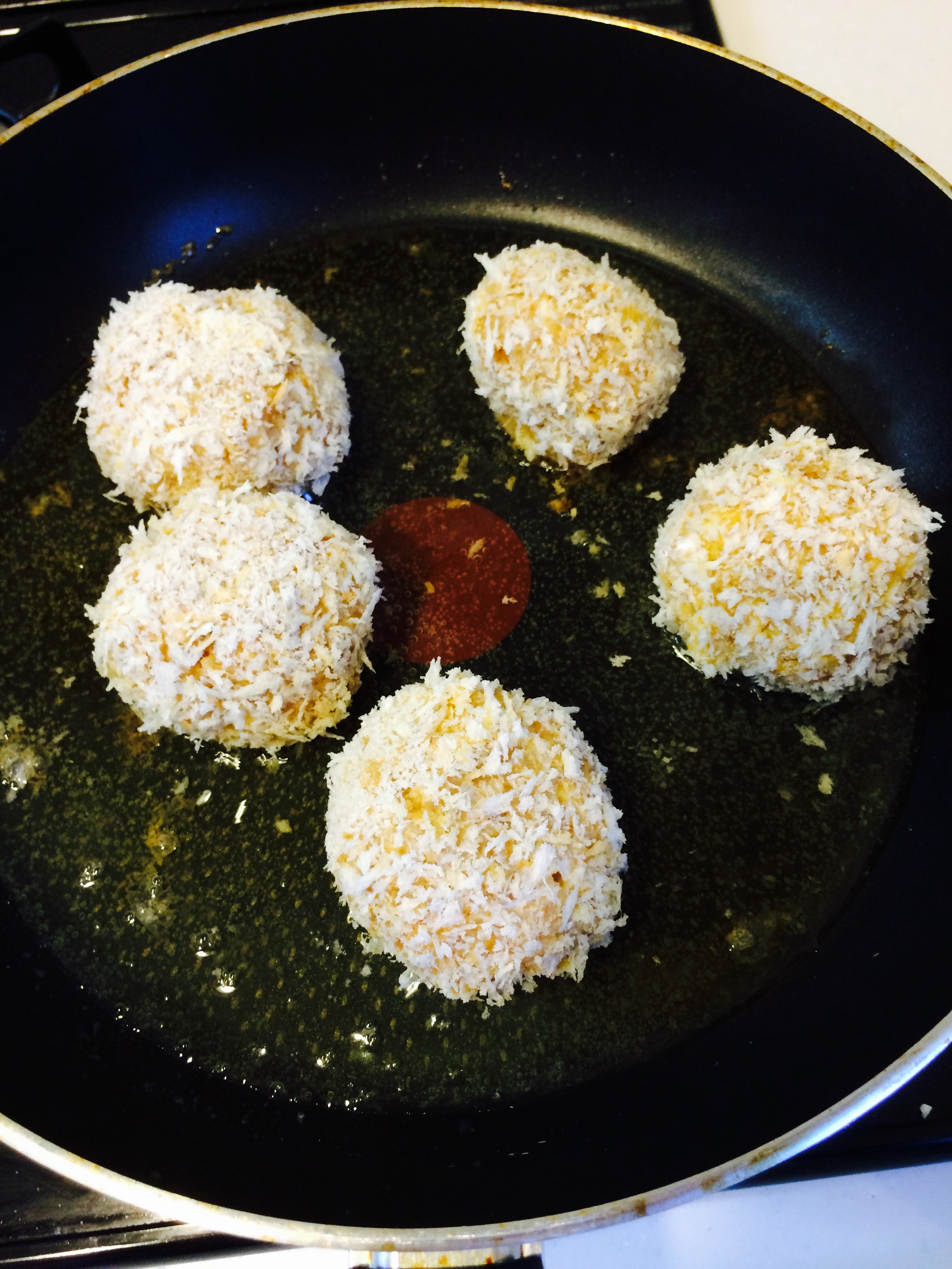 先ほどのおにぎりを卵液→小麦粉→パン粉の順につけて転がしながら焼き揚げしていきます