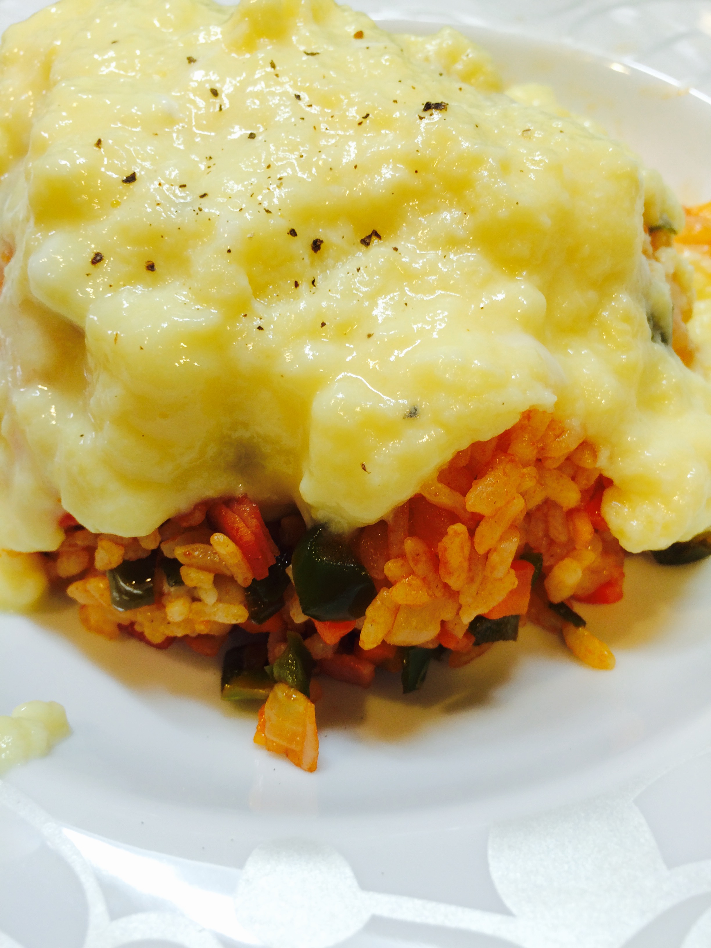 卵の材料を全て混ぜ合わせてフライパンで弱火でじっくり火をとおしてとろっとなってきたらケチャップライスの上にかけ、最後にコショウをさらに少し追加したら完成です。