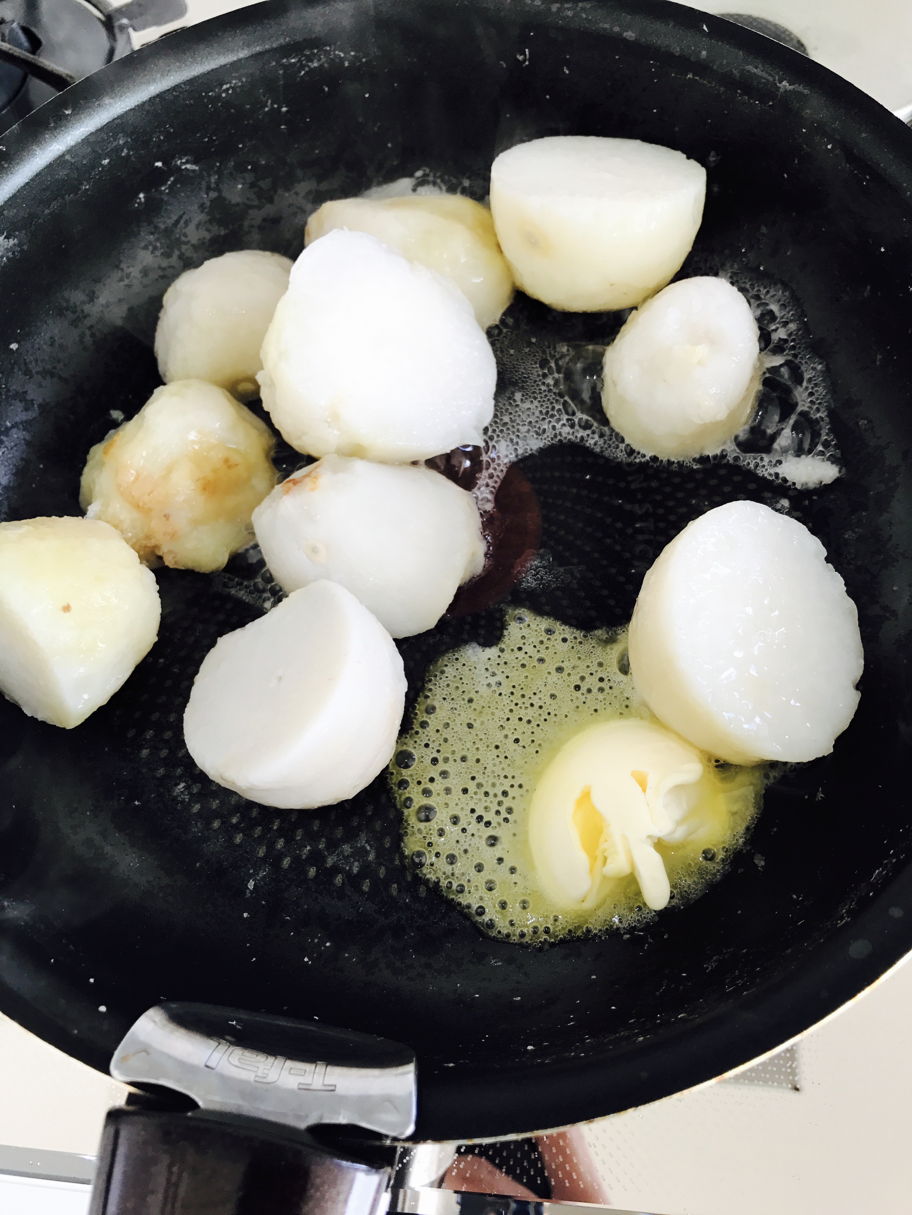 茹でて皮を剥いた里芋を半分にカットして、バターで焼き色をつけます