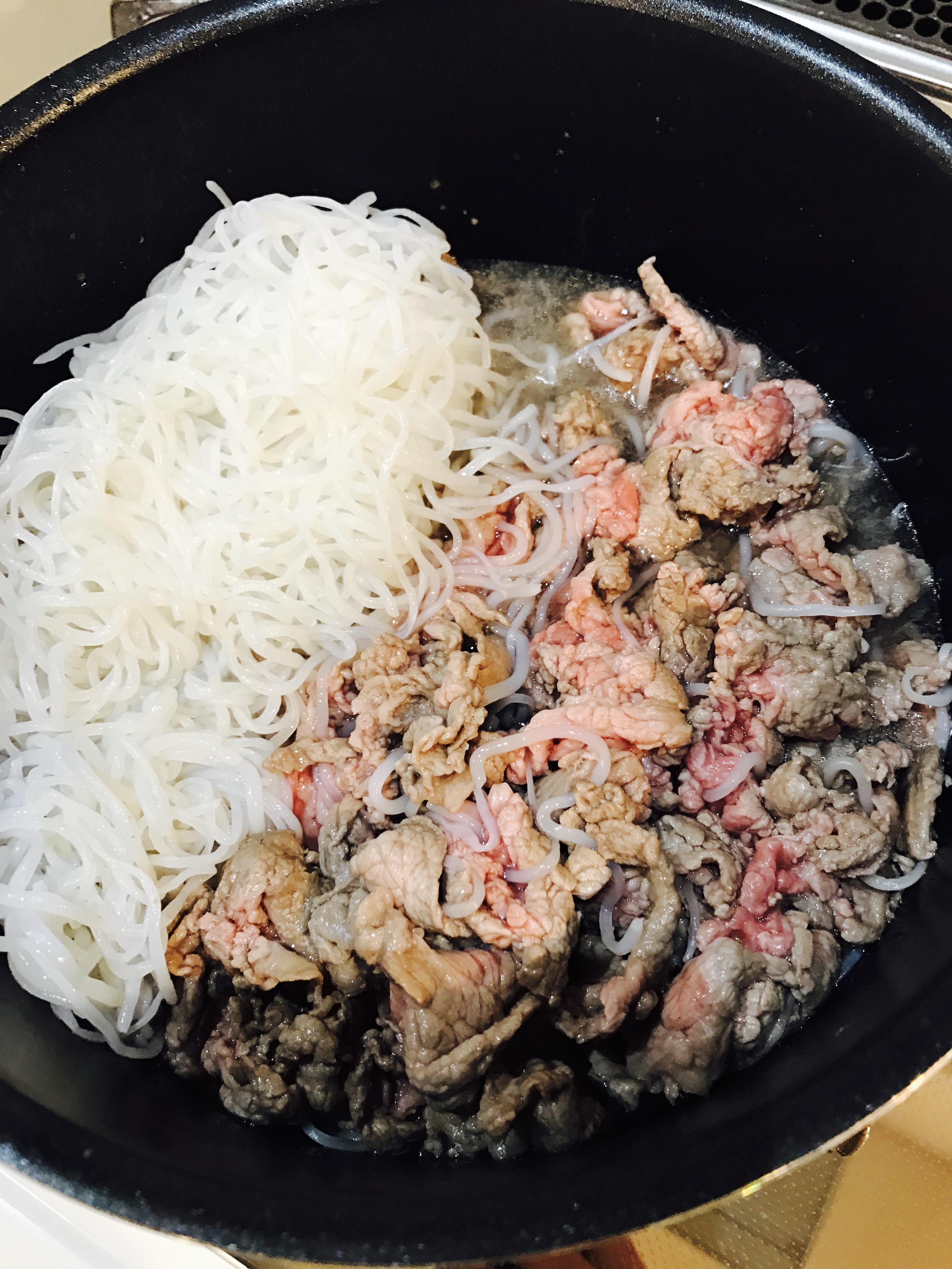 牛肉の色が変わったら酒を入れて煮立たせ灰汁を取り砂糖を加えます